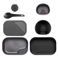 Consisting of plate with lid, two Fold-a-Cups (large and small), cutting board, spice shaker and spork.
