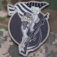 Kicking it old school with more pinup, BAR is the name of the gun for youngens out of the know. Can't get much more patriotic and sexy! Done in woven style to capture as much detail as possible. Happy to collaborate with the great Bawidamann on this guest design. www.bawidamann.com