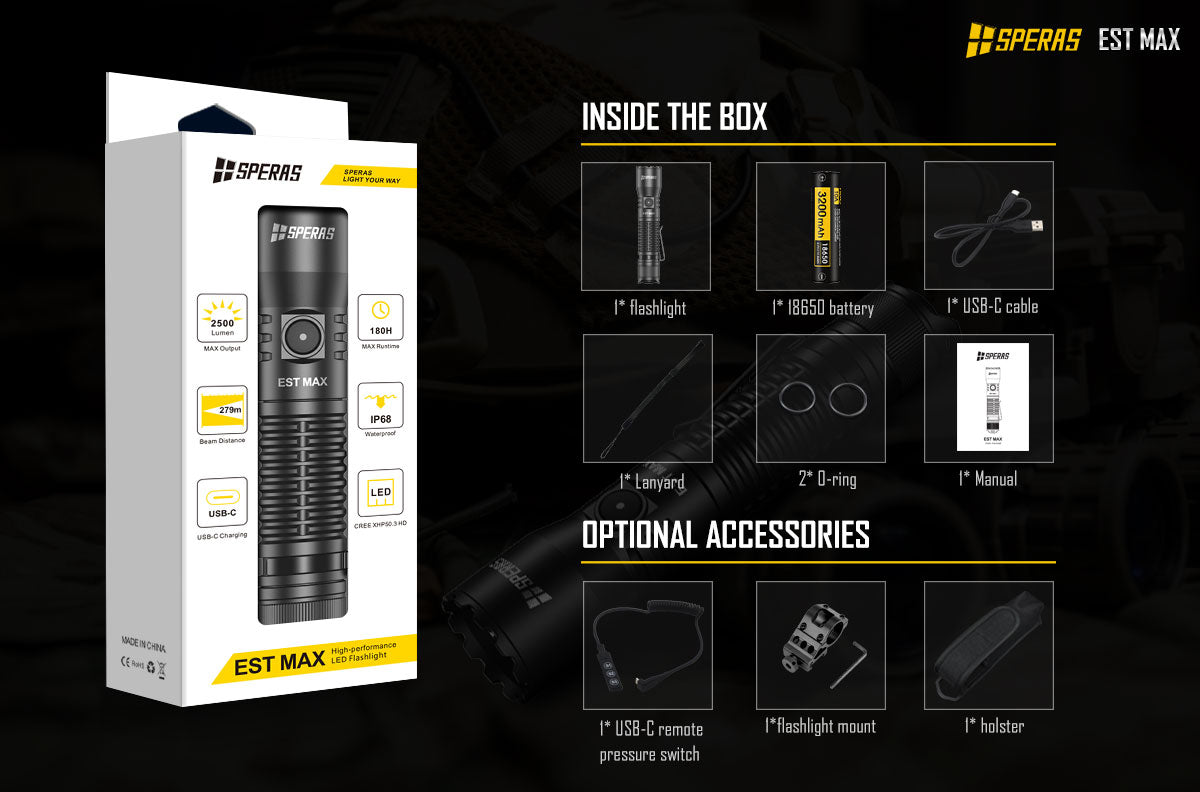 The SPERAS EST Max is a powerful tactical flashlight with a CREE XHP50.3 HD LED. Despite its compact size, it produces a 2500-lumen output with an impressive 279-meter throw, powered by a 10A high-discharging 3200mAh lithium battery. The advanced driver design provides seperate use of the tail button or side button to function. USB-C charging offers improved charging speed. This is an utility-type flashlight for police, security, camping, outdoor etc. use.
