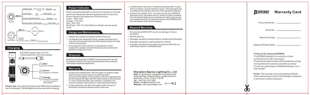Note: the above data has been measured in accordance with international flashlight testing standard ANSI/NEMA FL1 using a SPERAS 3.7V/3200mAh18650 10A HDC battery under laboratory conditions.