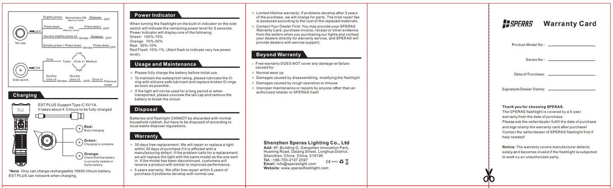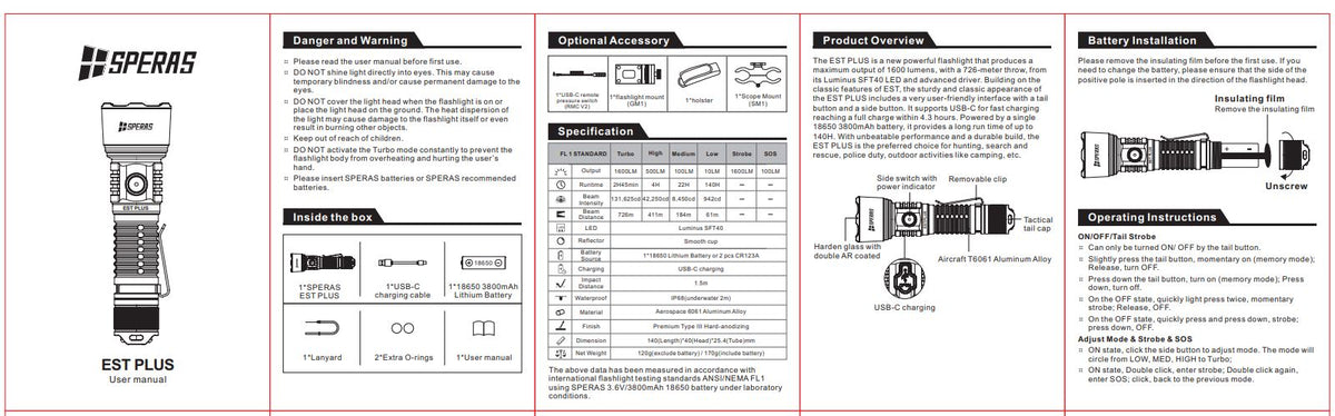 Note: the above data has been measured in accordance with international flashlight testing standards ANSI/NEMA FL 1 using SPERAS 3.6V/3800mAh 18650 battery under laboratory conditions.