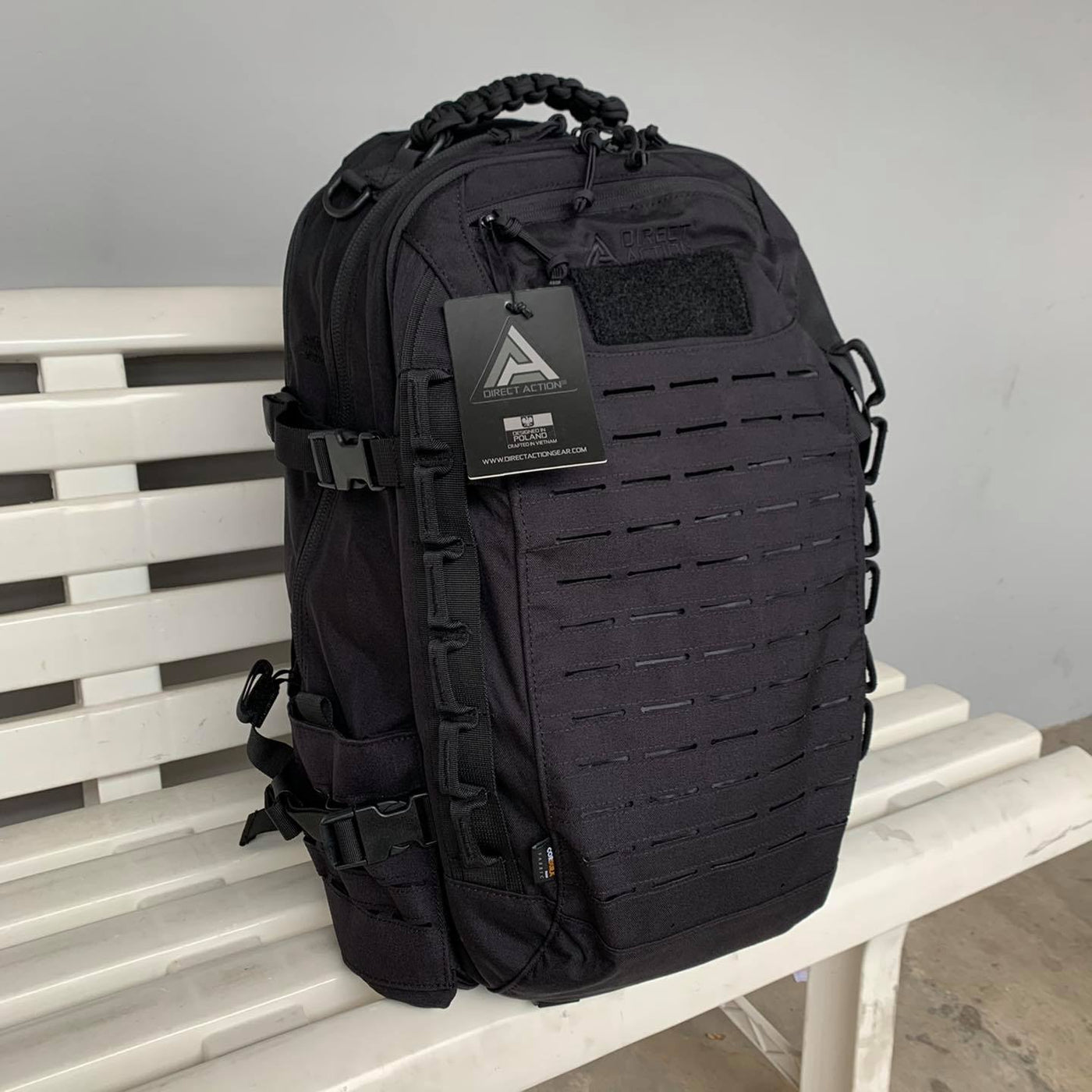 On the front there is also a soft Velcro for easy personalization. The front, sides of the backpack and the waist belt are partially covered with a laser cut modular system, compatible with MOLLE / PALS. The drag handle of the backpack is made of paracord. In an emergency, this handle can be untangled, giving us a total of 5.5 m of line. Profiled shoulder straps and a removable hip belt guarantee stable carrying of the backpack, even during dynamic activities. The hip belt can be used separately, with an additional pair of lightweight shoulder straps which are included in the set.
