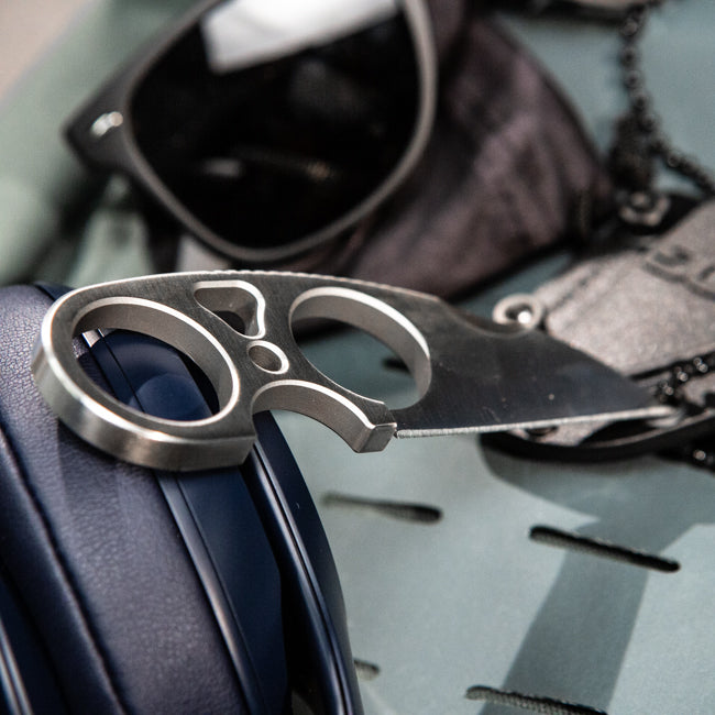 The Snarl is a fixed blade made from thick quarter-inch 8CrMov steel. This stealthy sheepsfoot neck knife has a 2.3-inch sheepsfoot style blade and a unique handle. The handle has two finger holes and jimping for different grips while maintaining ergonomics and comfort. The sturdy build and functional design makes it a great utility blade. It comes with a versatile hard molded nylon sheath with a robust removable clip and ball chain for carrying at the neck, on the belt, or in the boot.
