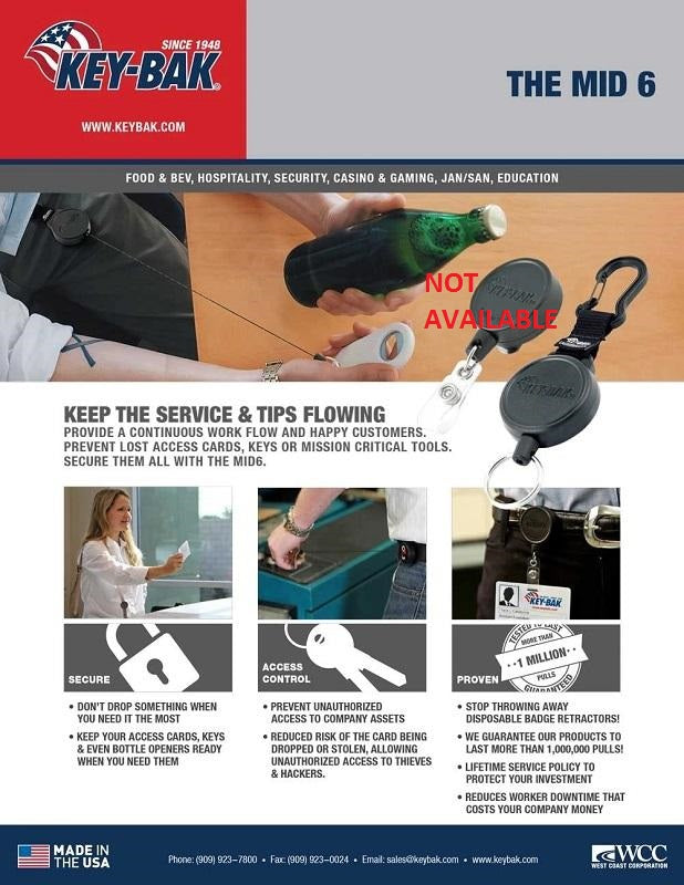 The MID6 Retractable Carabiner Keychain has a tough molded polycarbonate case, zinc alloy carabiner, stainless steel spring and strong retractable cord made with DuPont™ Kevlar® fiber. Grab your keys and let them go, the built-in tether retracts back into place until you need your keys again, no more digging through your pockets or purse to get your keys. With a MID6 Retractable Carabiner Keychain your keys or small tools will be secure and accessible.