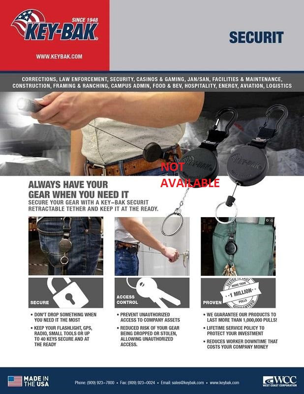 The SECURIT Heavy Duty Carabiner Retractable Keychain conveniently attaches to almost anything, making this one of the most widely used retractable keychains on the market. Built in the USA, the SECURIT has a strong molded black polycarbonate case and a retractable cord made with DuPont™ Kevlar® fiber. Attach your keys or small tools to the zinc plated split ring and secure the carabiner to your belt clip, work belt or backpack. When you need your keys just pull them out, when you're done let them go and the built-in tether retracts back into place until you need them again. When you need a versatile retractable reel the SECURIT Heavy Duty Carabiner Keychain is your best option.