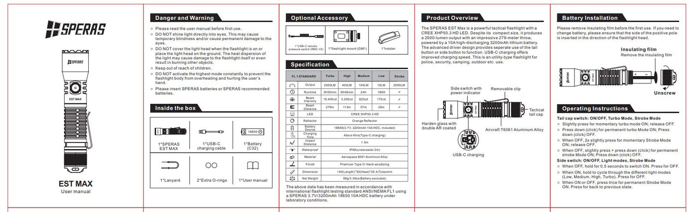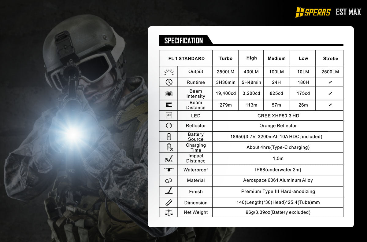 The SPERAS EST Max is a powerful tactical flashlight with a CREE XHP50.3 HD LED. Despite its compact size, it produces a 2500-lumen output with an impressive 279-meter throw, powered by a 10A high-discharging 3200mAh lithium battery. The advanced driver design provides seperate use of the tail button or side button to function. USB-C charging offers improved charging speed. This is an utility-type flashlight for police, security, camping, outdoor etc. use.