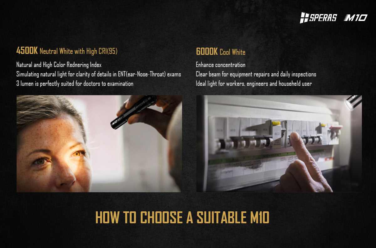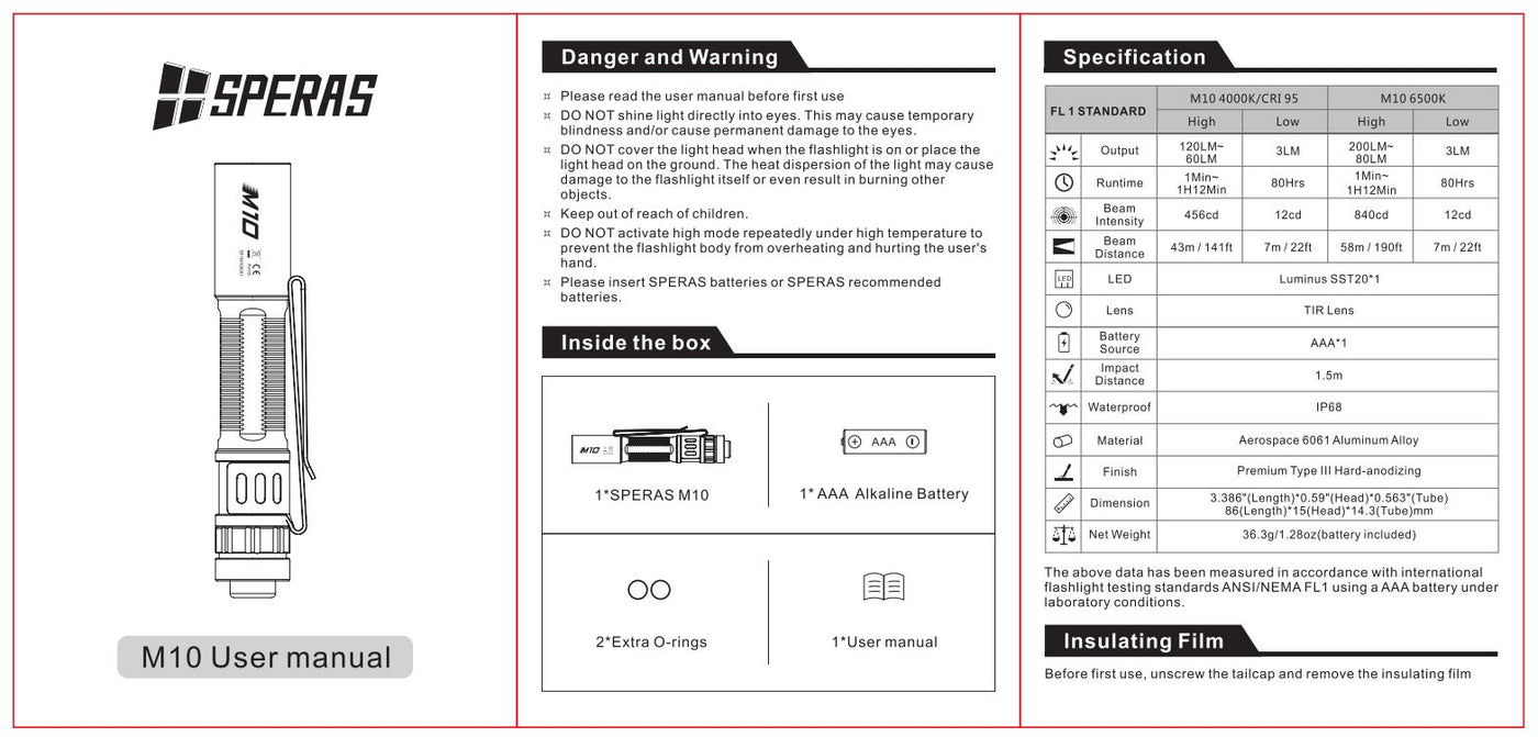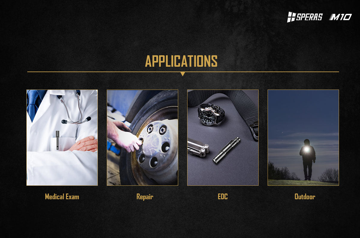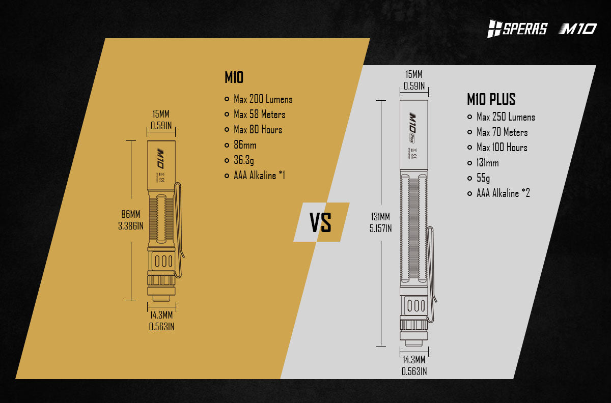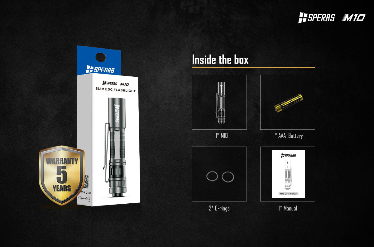 The SPERAS M10 is a slim tail switch flashlight powered by a single AAA battery with a max output of 200 lumens. It is equipped with an excellent LED paired with a TIR optic lens producing a soft and balanced beam. It also has a dual direction clip for multiple carrying options such as a backpack strap or a pocket. M10 is an incredibly convenient illumination tool to being with you everywhere.