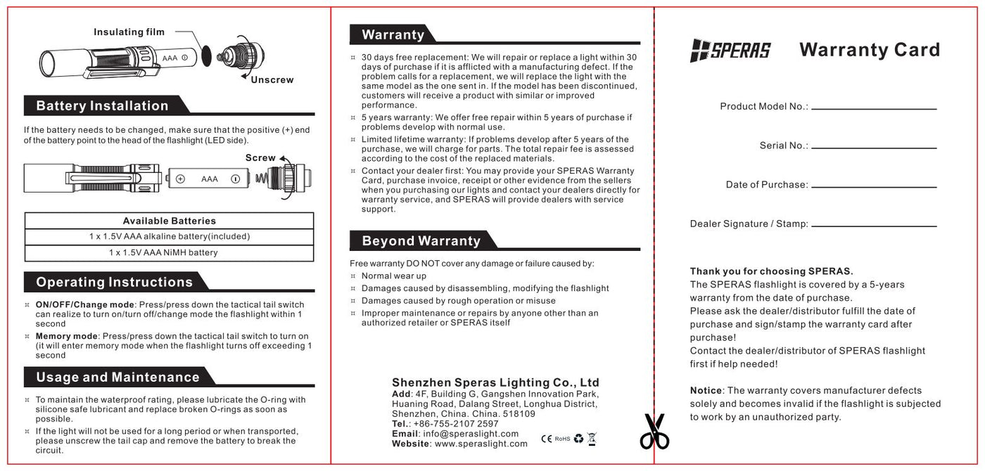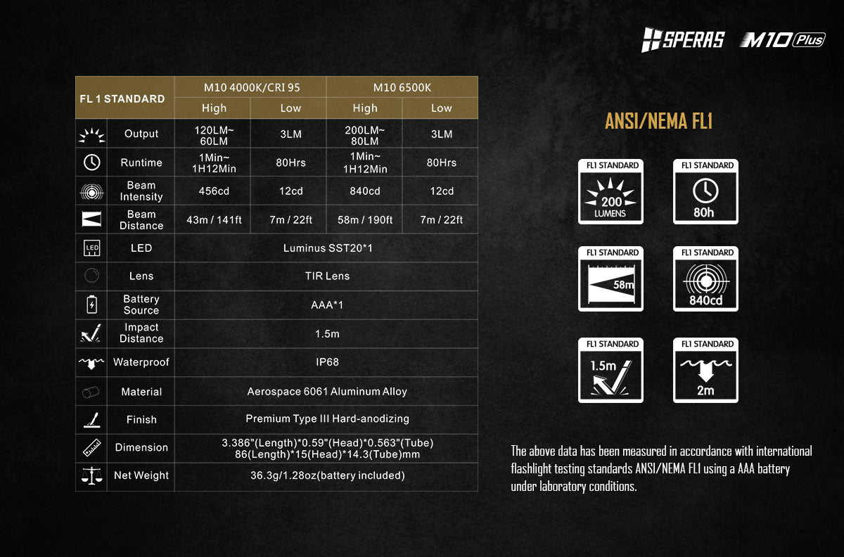 Note: The above data has been measured in accordance with international flashlight testing standards ANSI/NEMAFL1 using a AAA battery under laboratory conditions.