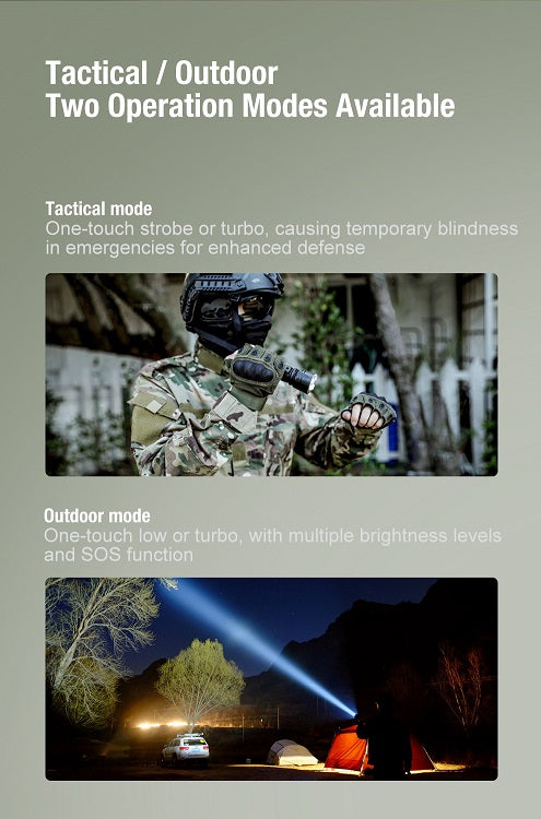 - Tactical or Outdoor modes customize access to Turbo, Strobe, and SOS