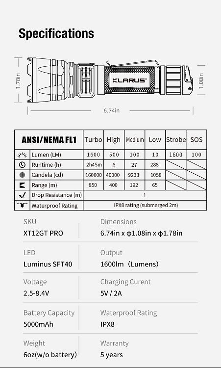 Blast through the night with the Klarus XT12GT Pro! Access up to 1,600 lumens in a refined beam that enables you to scour up to half a mile away. This light packs the punch you need for search and rescue missions, while still remaining lightweight and portable enough to use for Law Enforcement or everyday jobs. The XT12GT Pro features 2 mode-access settings, Tactical and Outdoor, to cater to your specific needs in a light. Tactical mode features quick access to Turbo and Strobe, enabling you to utilize these tools with speed and ease. Outdoor mode includes access to SOS in case you need to signal during emergencies.
