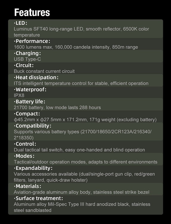 You'll have a wide range of fuel options because the XT12GT Pro supports a working voltage from 2.5 to 8.4V. This allows your choice of 1 x 21700 or 18650, or 2 x CR123As, 16340s, or 18350s. The flexibility in fuel choices allows you to power your light with whatever is on hand or available. Customize your light with ample compatible accessory options, including barrel clamps, red or green filters, remote control cable, or tactical holsters.