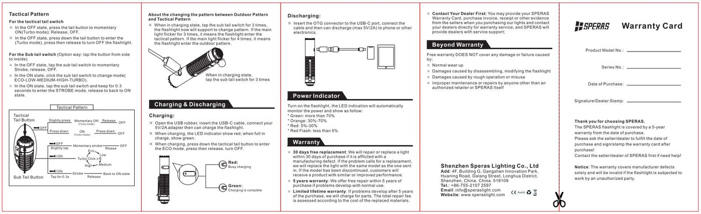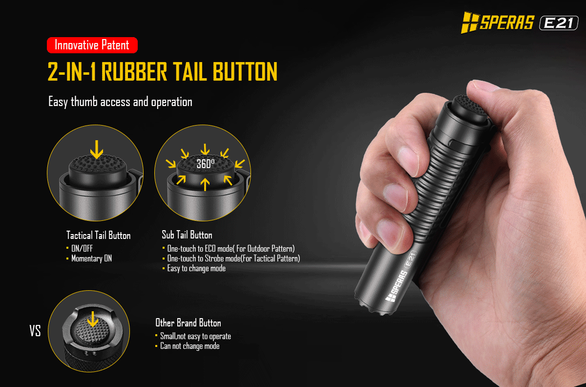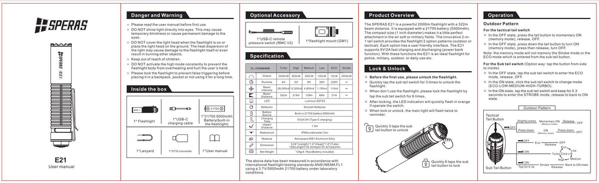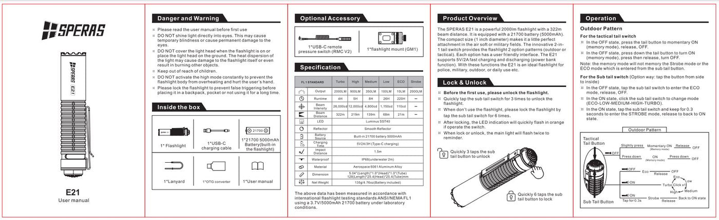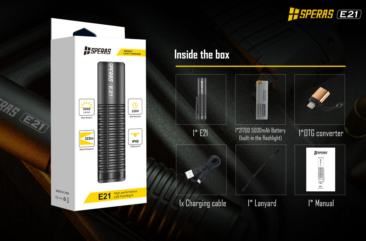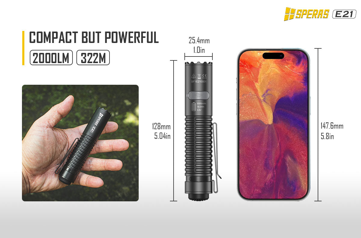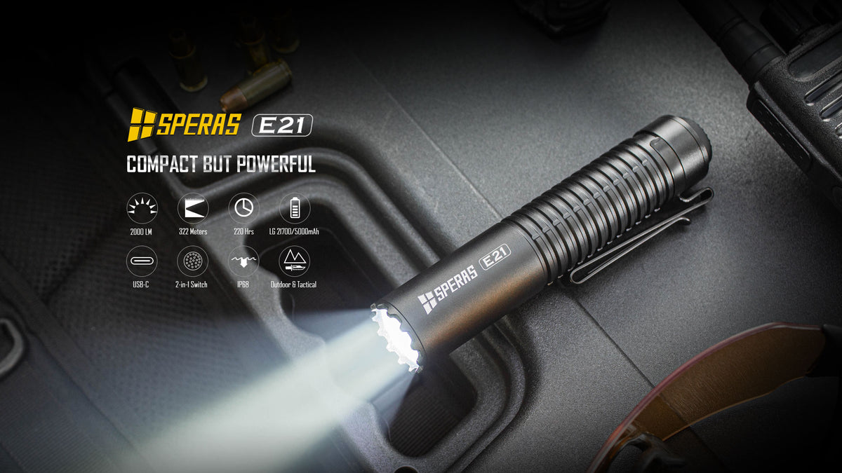 The SPERAS E21 is a powerful 2000lm flashlight with a 322m beam distance. It is equipped with a 21700 battery (5000mAh).The compact size (1 inch diameter) makes it a little perfect attachment in the air soft or military fields. The innovative 2-in-1 tail switch provides the flashlight 2 option patterns (outdoor or tactical). Each option has a user friendly interface. The E21 supports 5V/2A fast charging and discharging (power bank function). With these functions the E21 is an ideal flashlight for police, military, outdoor, or daily use etc.