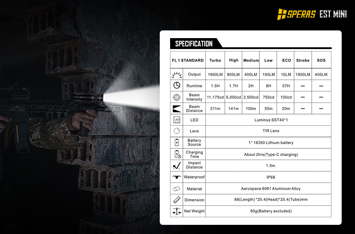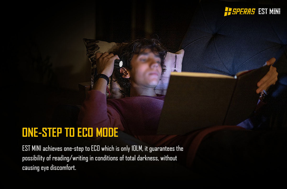 SPERAS EST Mini boasts a remarkable maximum output of 1900lm and a throw of 211 meters in a compact size. It has simple user interface which could be easy to enter the ECO mode and turbo mode. Equipped with 18350 1100mAh, giving the flashlight a max running time of 57 hours and it also support USB-C charging. SPERAS EST Mini is a mighty flashlight for outdoor, tactical, security or even general use.