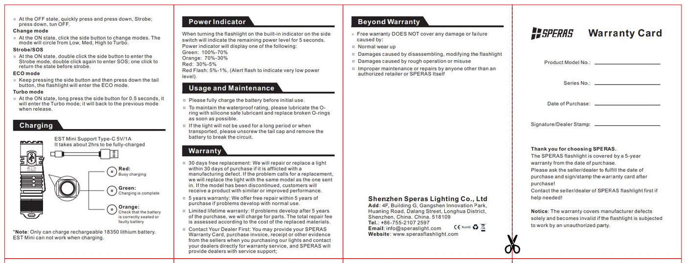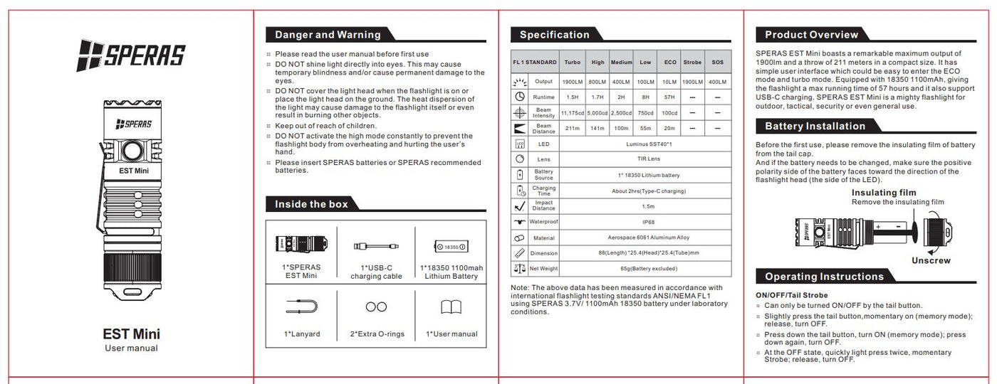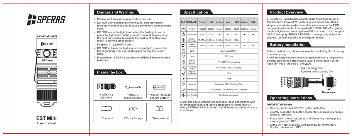 The above data has been measured in accordance with international flashlight testing standards ANSI/NEMA FL1 using a SPERAS 3.7V/1100mAh 18350 battery under laboratory conditions.