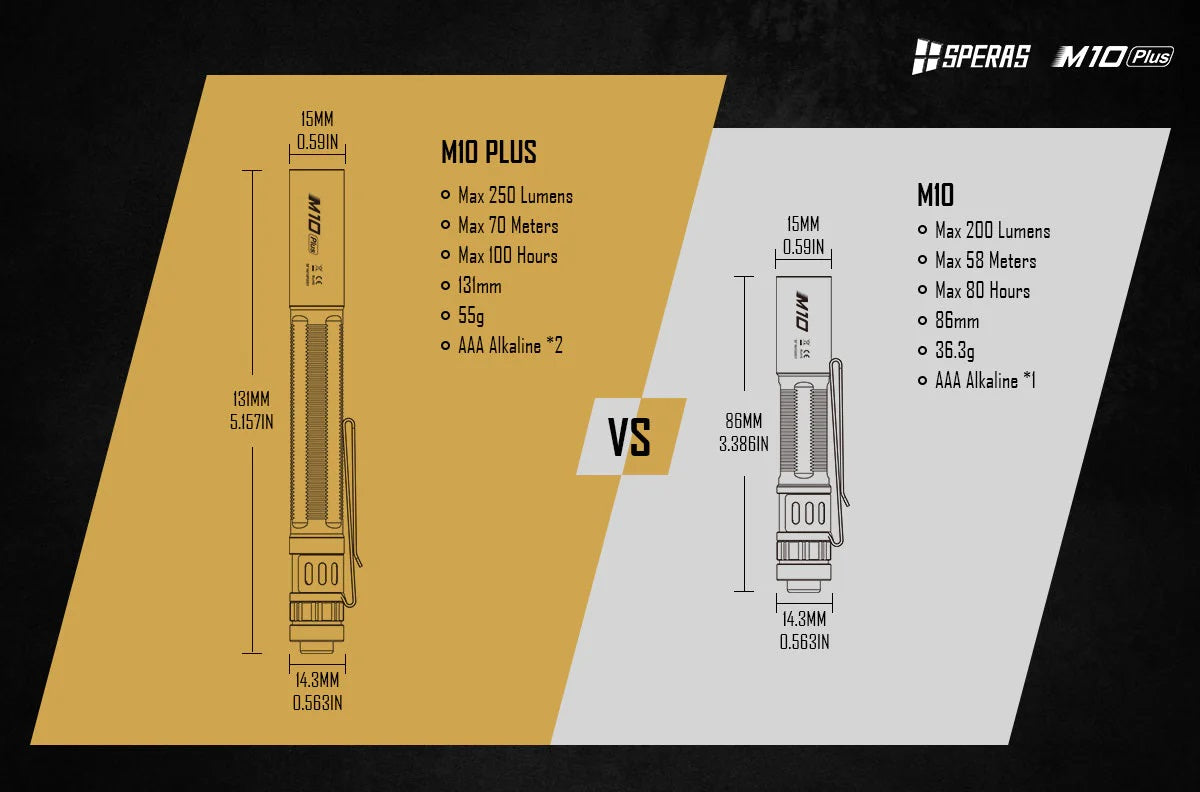 The M10 Plus is a slim metal tail switch EDC flashlight powered by two AAA flashlight powered by two AAA batteries. It is equipped with the high performance LED, paired with a PMMA TIR optical lens, which produce a soft and balanced beam with a max 200 lumen setting. With double battery power and compared the M10, its runtime reaches to 100 hours at low mode. The slip and light weight design are perfect for handheld use with its non-slip knurling. It also features a two-way pocket clip that can easily clip on the pocket or backpack strap. Powerful, stylish and extended running time, the M10 Plus is a great EDC light tackle everyday tasks.