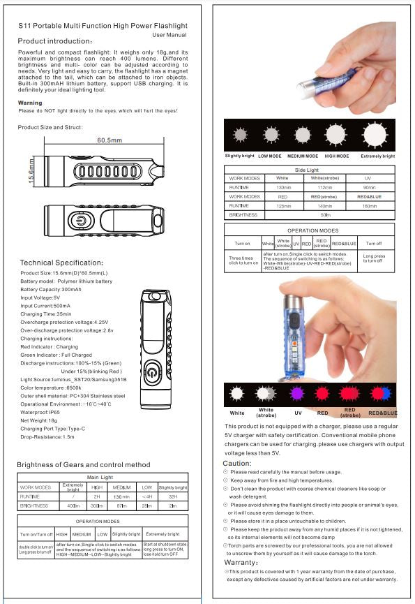The Speras S11 is a mini functional key light with max lumen 400 lumens; The side light including UV lamp, Red flash, red-blue flash, white flash, is a very good signal light for police; It is built-in 300mah battery and USB-C charging with magnet tail for free hands. It is a great edc key light.