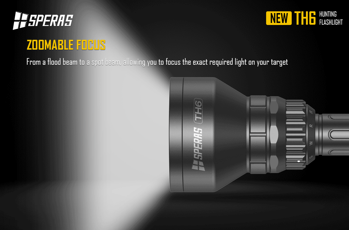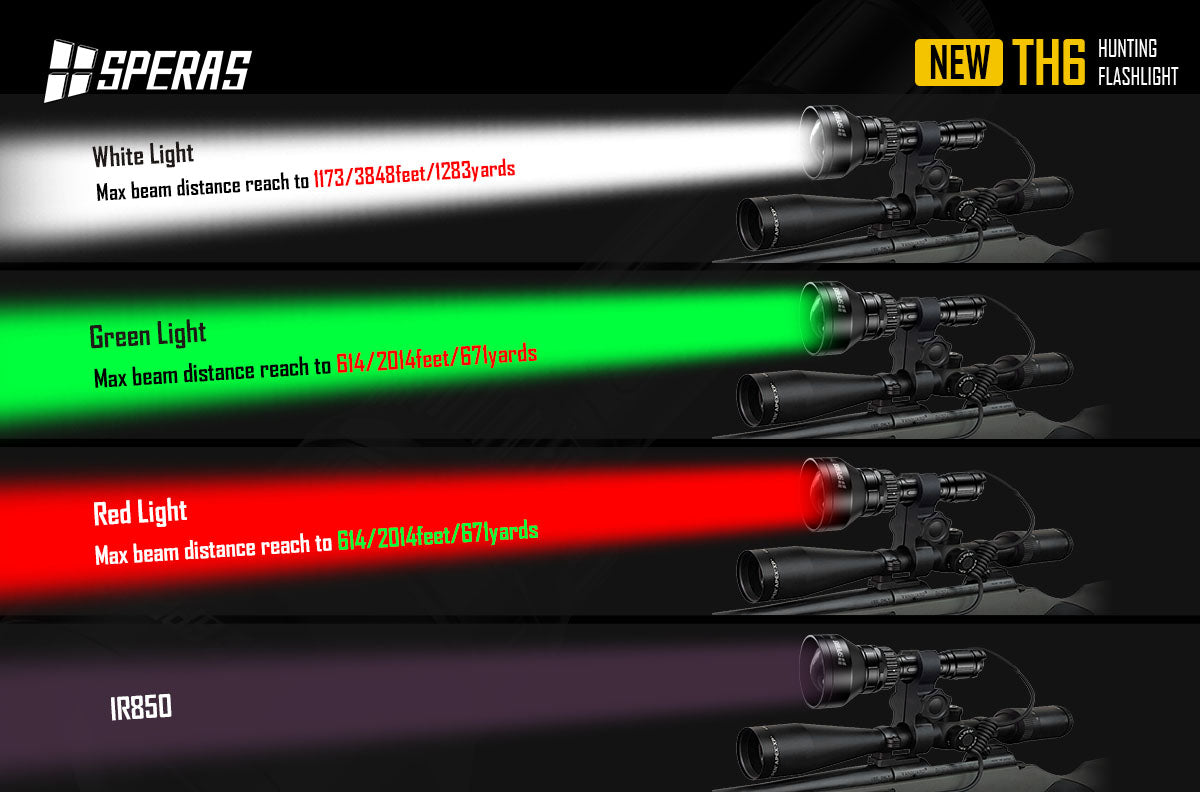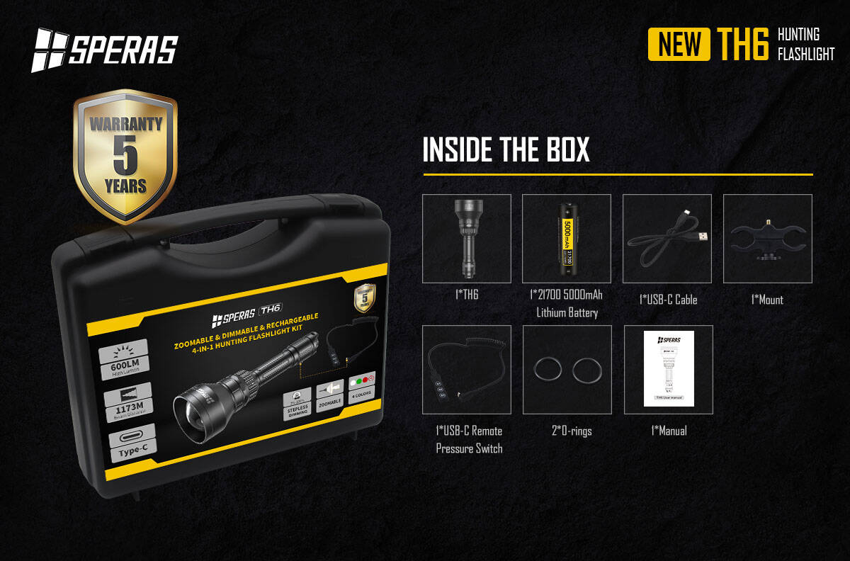 SPERAS TH6 is specially designed for hunters with 4 color LED sources (white, red, green, lR850) in one flashlight which allows you to instantly change the LED by rotating the switch to meet different targets in various hunting application. And it is adjustable focus from flood beam to focus beam and allows changing the brightness to help hunters to choose the required light. The Type C charging and USB-C remote pressure switch share a same port to provide convenient operation. It also includes a 21700 5000mAh premium rechargeable battery to keep your light running all night long. With 66mm lens, TH6 has more than 1173 meters beam range which is your first choice for hunting.