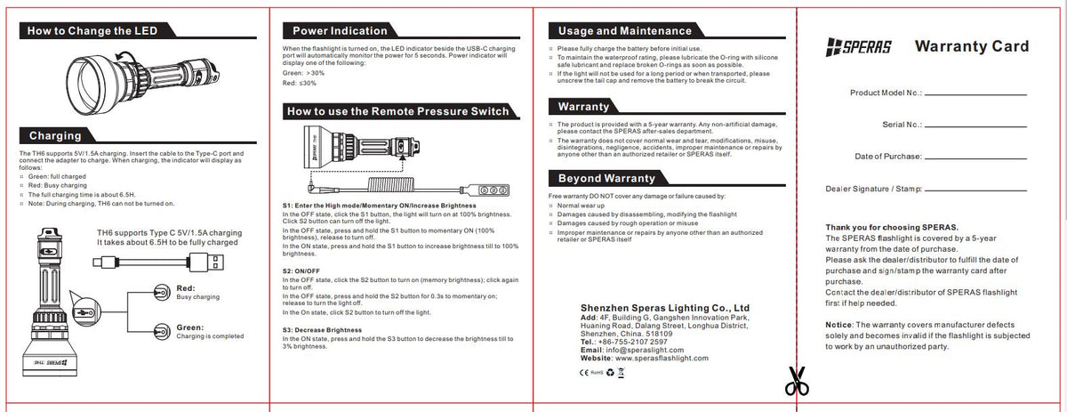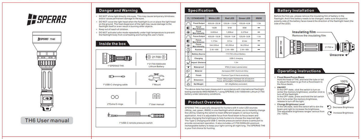 - USB-C rechargeable flashlight: SPERAS TH6 is a USB-C rechargeable flashlight which support the clear LED indication to show the battery status.