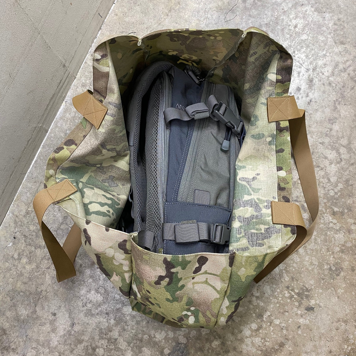 These Tote bag could easily fit in a fully loaded Direct Action Dragon Egg backpack, or even something slightly bigger. There is no inner or outer compartments on this bag, it's just a very big tote bag! You would never need to buy another tote bag in your lifetime after getting this 1, probably can pass down to your grandson too.