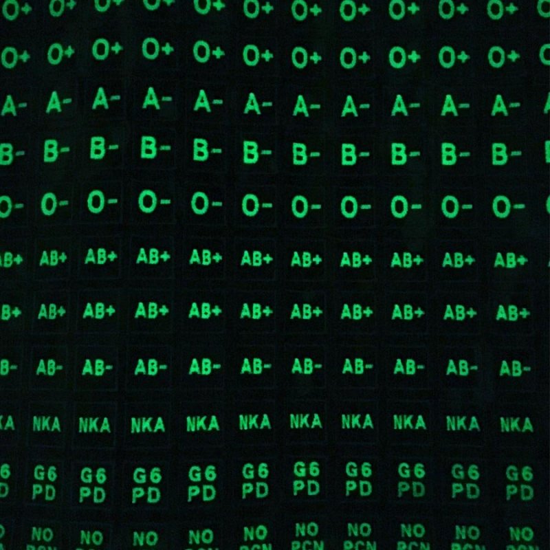Our self-made Blood Group patches in Black Fabric and Glow in the Dark threads, illuminating function(with proper light charging).